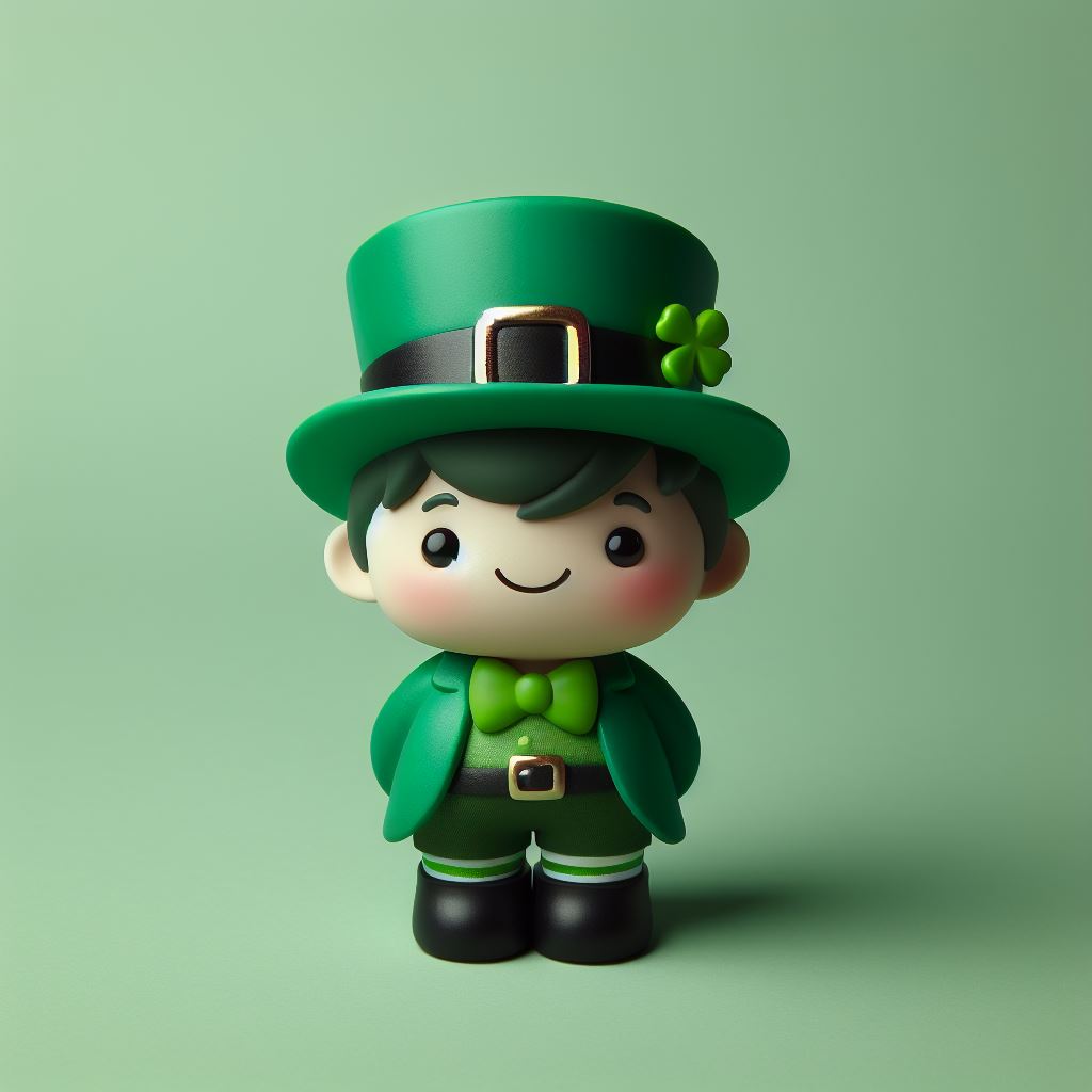 A smiling leprechaun figurine wearing a green hat, jacket, and pants stands on a green background.