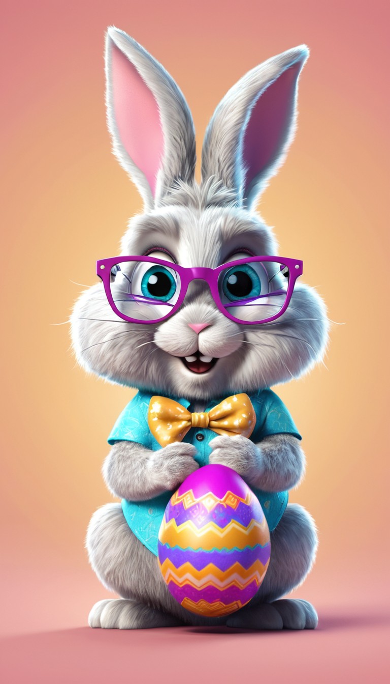 A cartoon bunny with glasses and a bow tie holds a colorful Easter egg.
