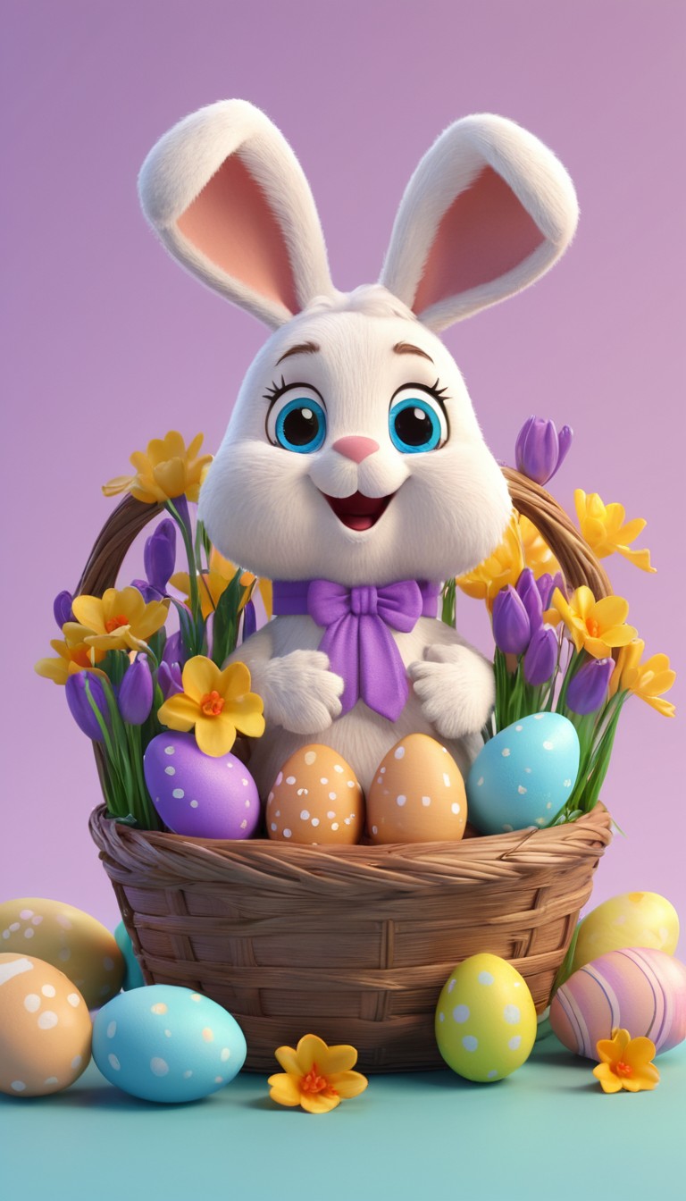 A cute, cartoon bunny sits in a basket of Easter eggs and flowers.