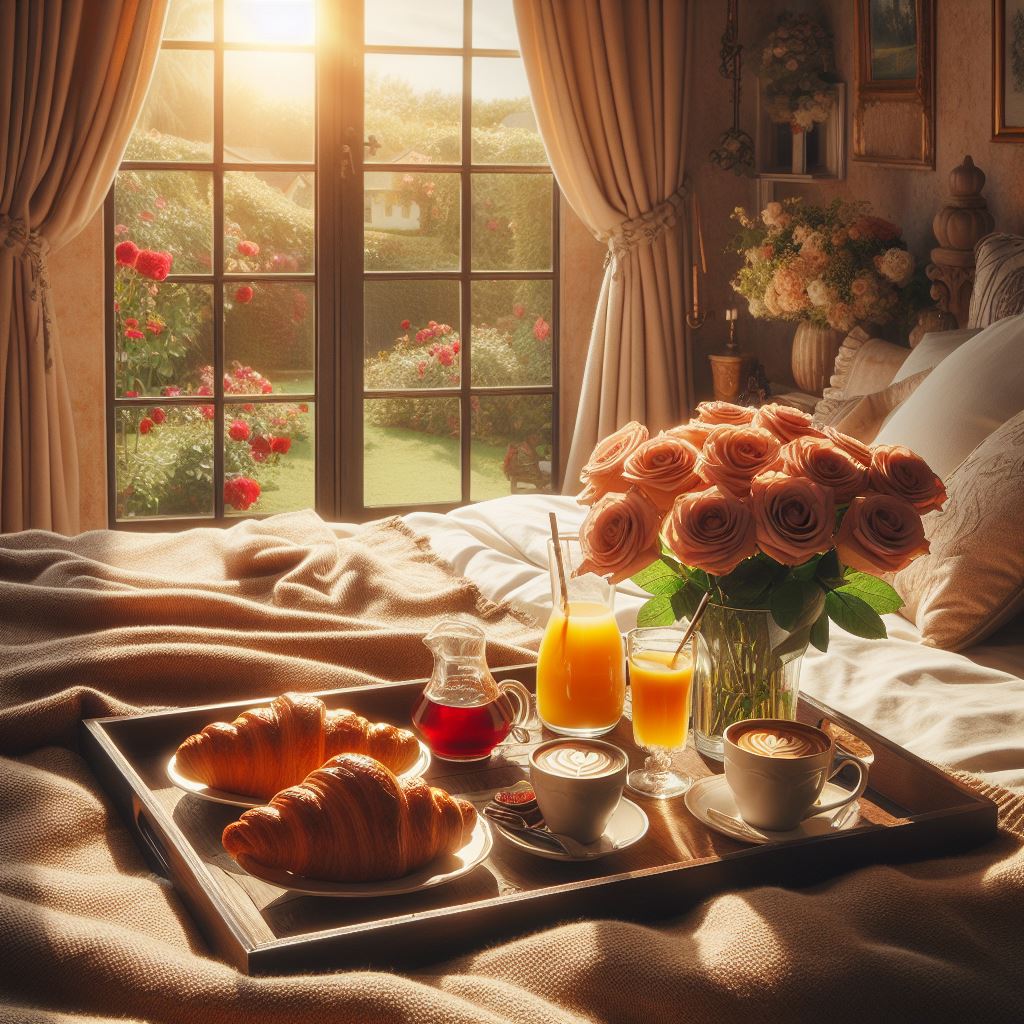bed, bedroom, breakfast, coffee, cozy, croissants, decor, flowers, garden, home, juice, life, morning, relaxing, romantic, roses, still, sunlight, tray, window