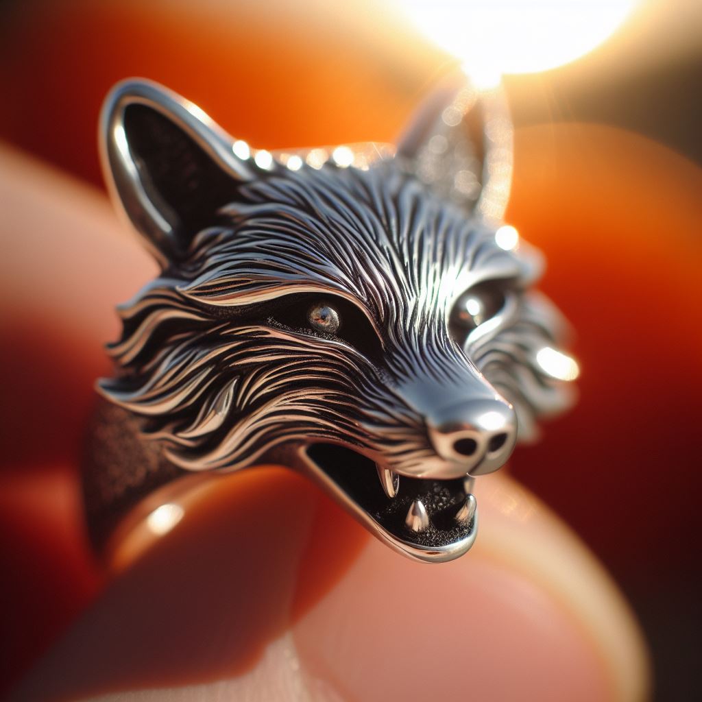 A silver wolf ring with detailed fur and sharp teeth is held in a hand, illuminated by the warm sunlight.
