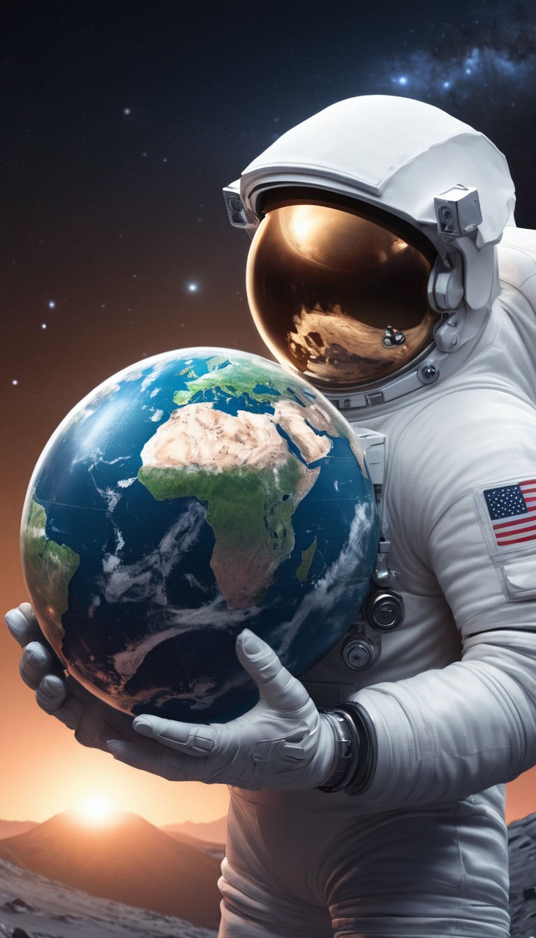 An astronaut in a white spacesuit holds a miniature Earth on a rocky planet under an orange glow from the setting sun
