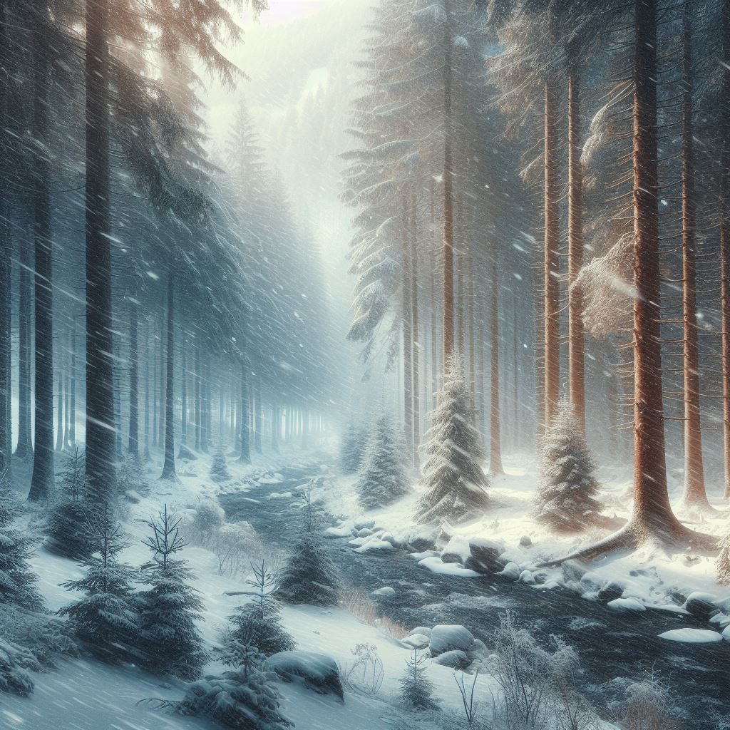 Snow falls in a winter forest, blanketing tall pines and a winding stream. Sun shines through trees, casting warm glow on snowy landscape