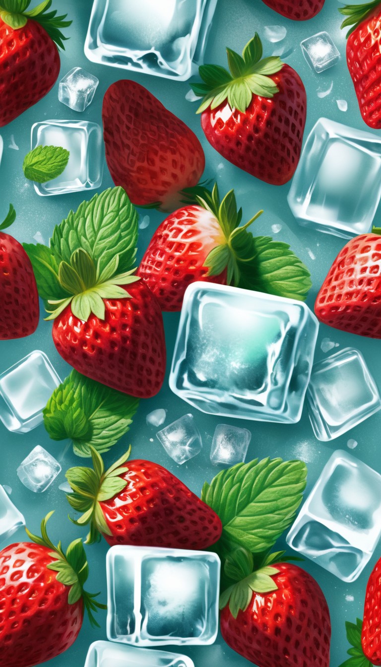 background, beverage, blue, cool, cube, drink, food, fruit, green, ice, juicy, leaf, mint, pattern, red, refreshing, strawberries, summer, sweet, texture