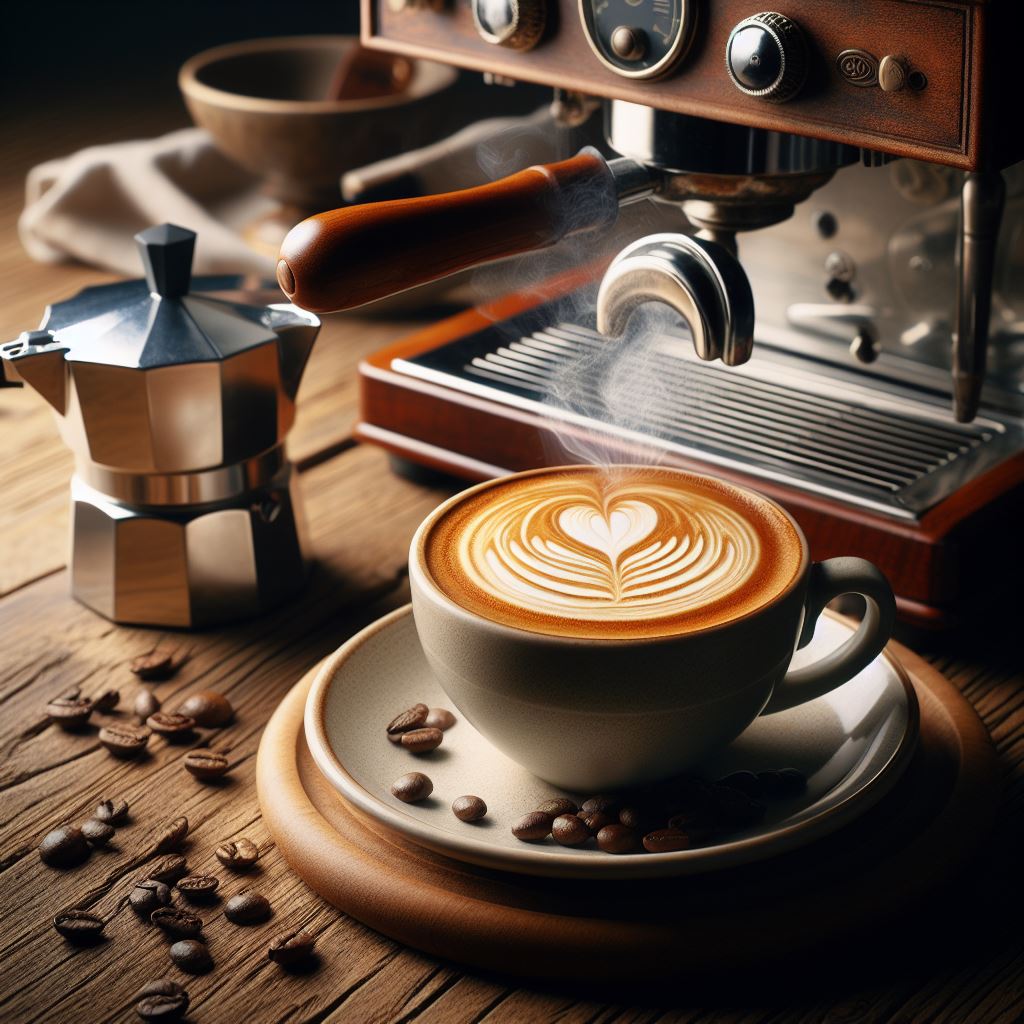 A freshly brewed latte with a heart design sits on a wooden table next to a vintage espresso machine and a coffee pot.