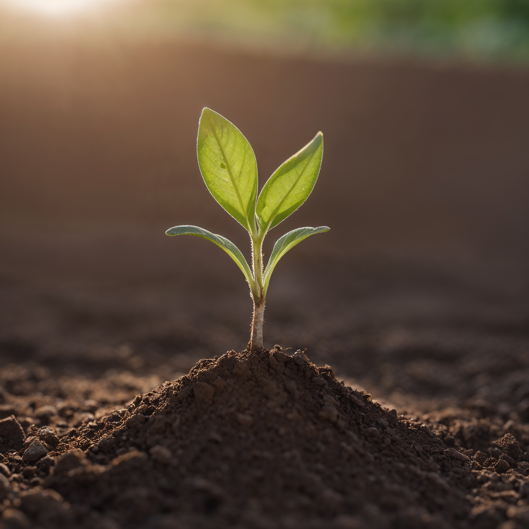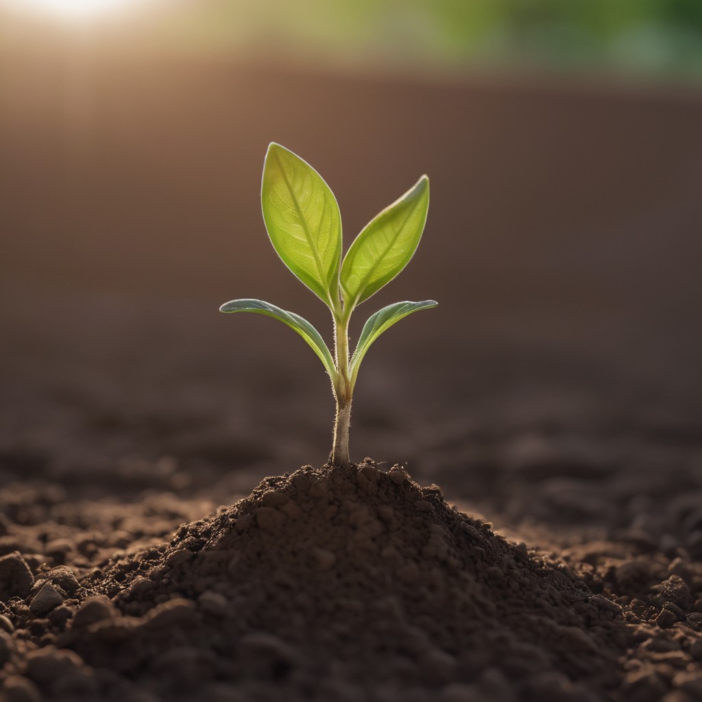 A young seedling with two leaves grows out of the soil, bathed in soft sunlight.