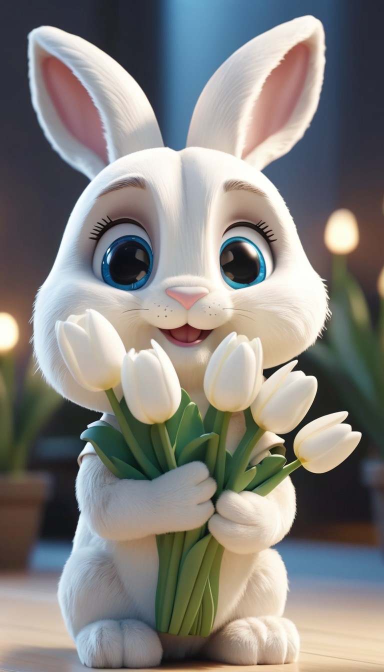 A cartoon bunny with big blue eyes holds a bouquet of white tulips.