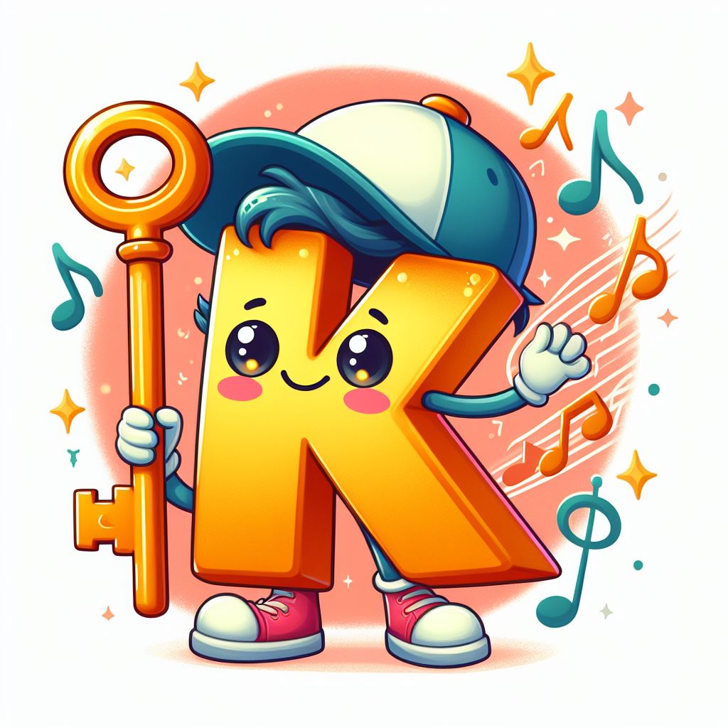 A cartoon letter K wearing a cap and holding a large key, with music notes and stars around it.