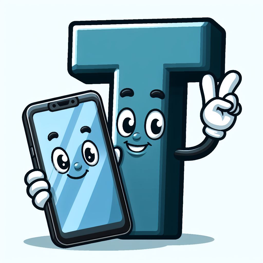 A cartoon letter T with a smiling face holds up a smartphone with a smiling face for a selfie.