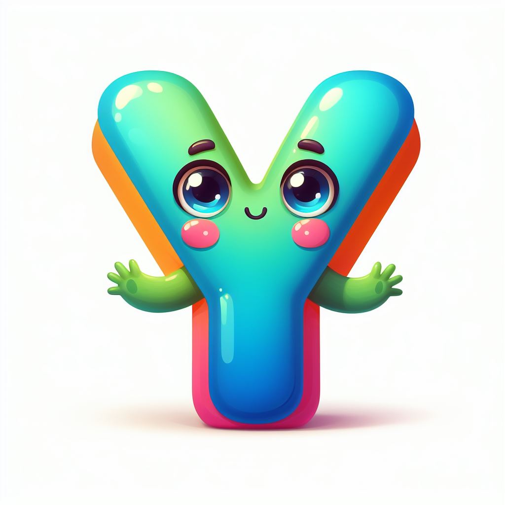 A cartoon letter Y with a smiling face and large eyes waves hello.