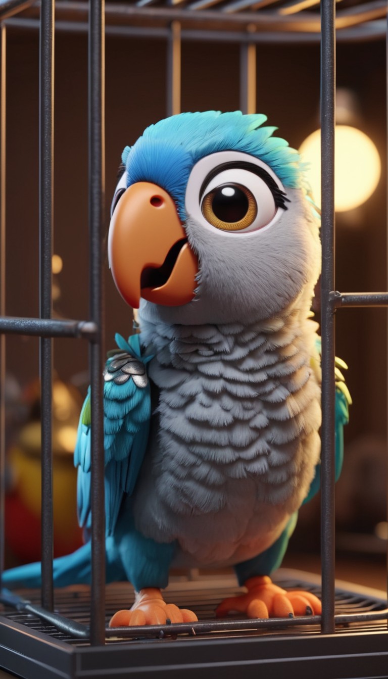 A blue and grey parrot with large eyes looks out from its cage.