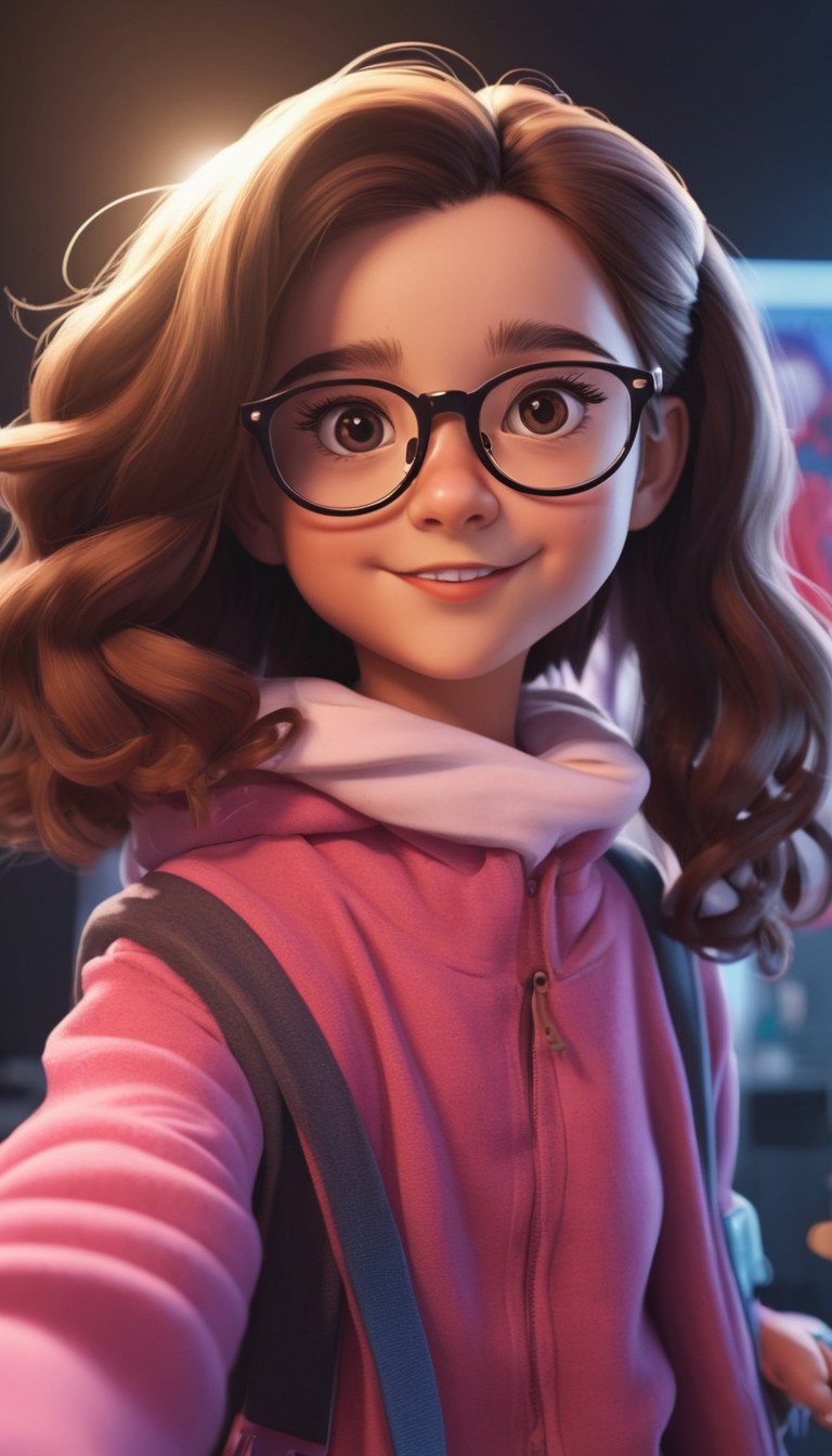 A young girl with curly brown hair and glasses smiles as she takes a selfie in a pink jacket.