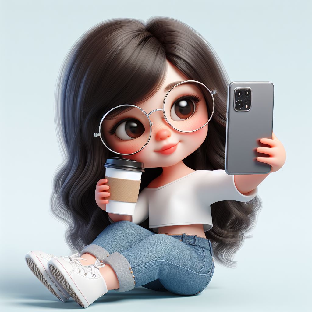 A cartoon girl with big eyes and glasses is taking a selfie while holding a cup of coffee.