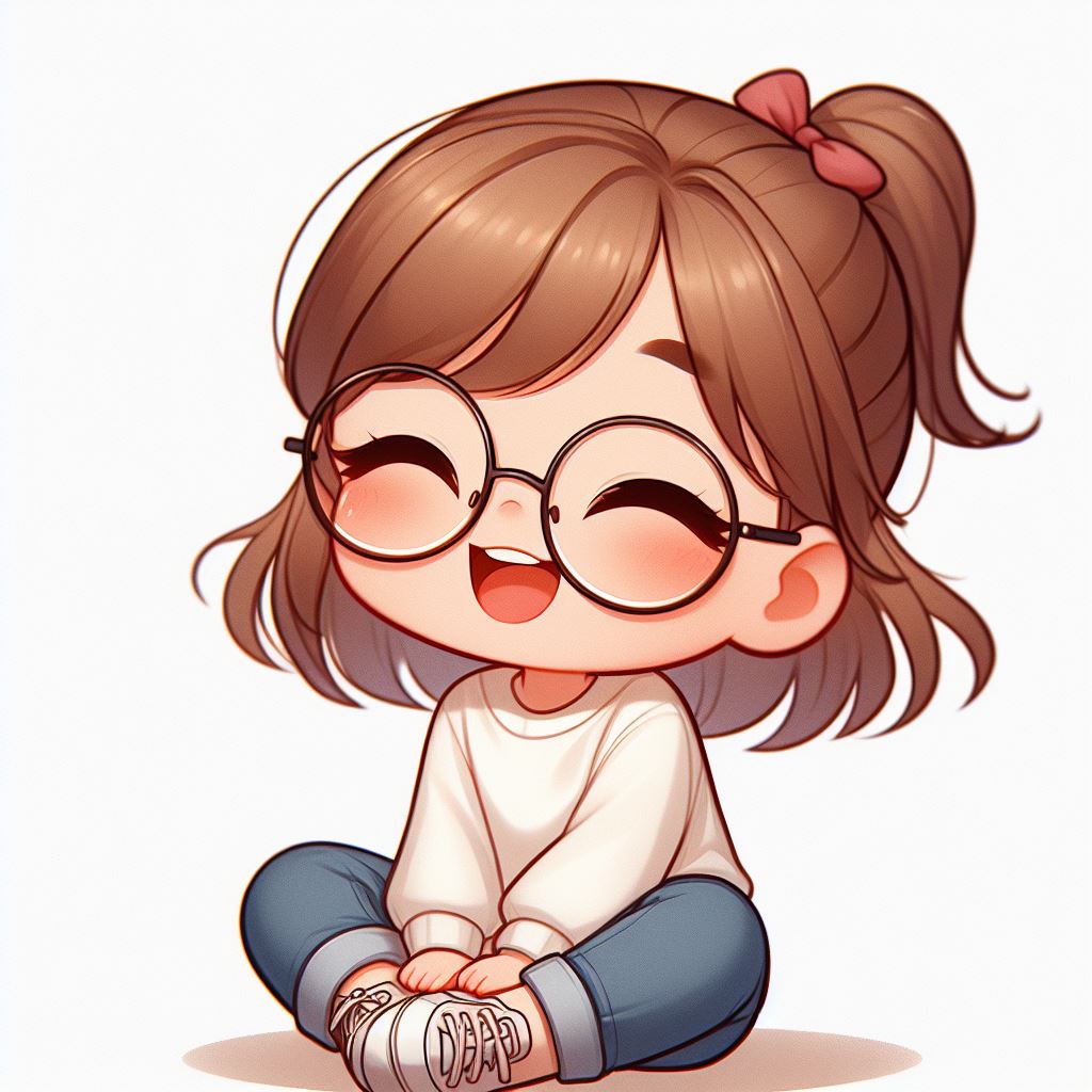 anime, art, blue, brown, cartoon, crossed, cute, digital, girl, glasses, hair, happy, illustration, jeans, kawaii, legs, sitting, smile, sweater, white
