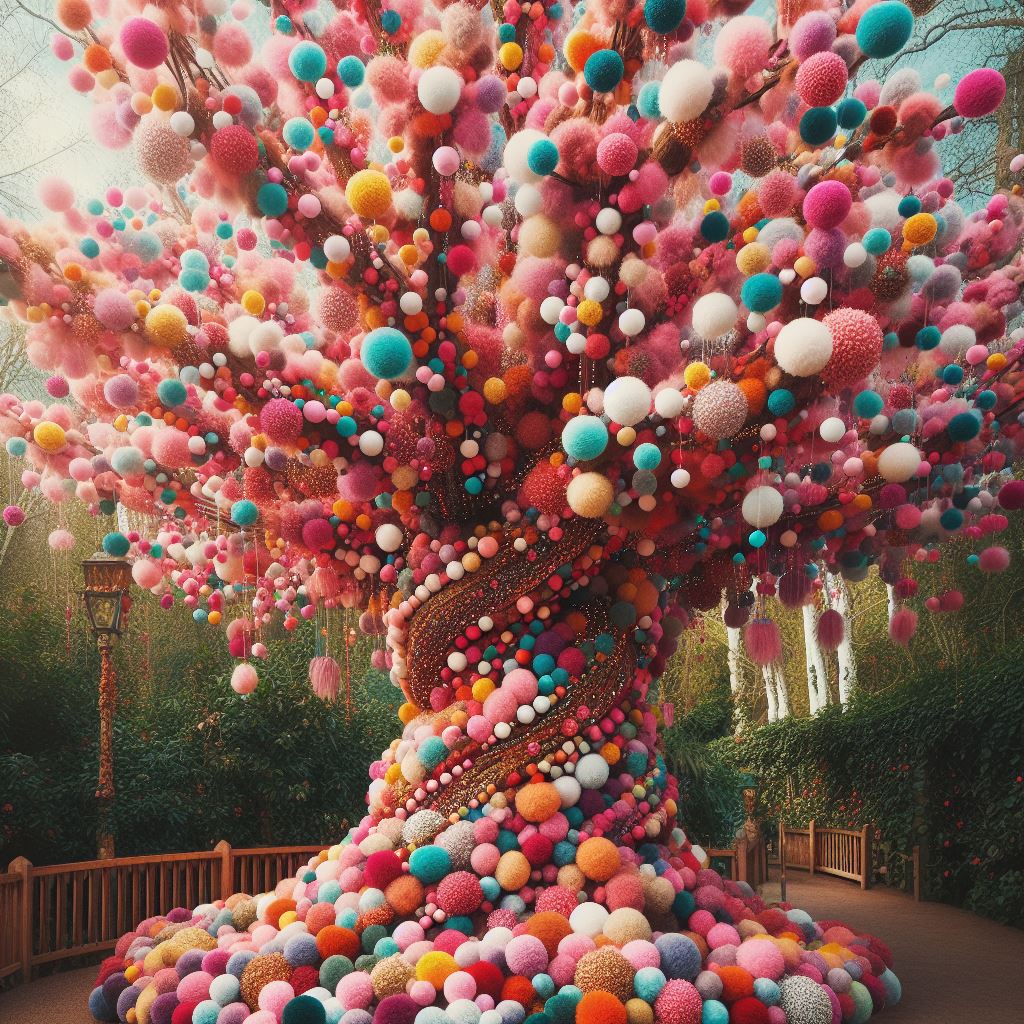 A whimsical tree adorned with colorful pom-poms stands in a park setting.