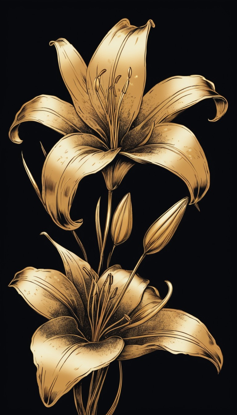 art, background, beauty, black, bloom, botanical, classic, delicate, design, digital, drawing, elegance, floral, flower, gold, graphic, illustration, lily, nature, vintage