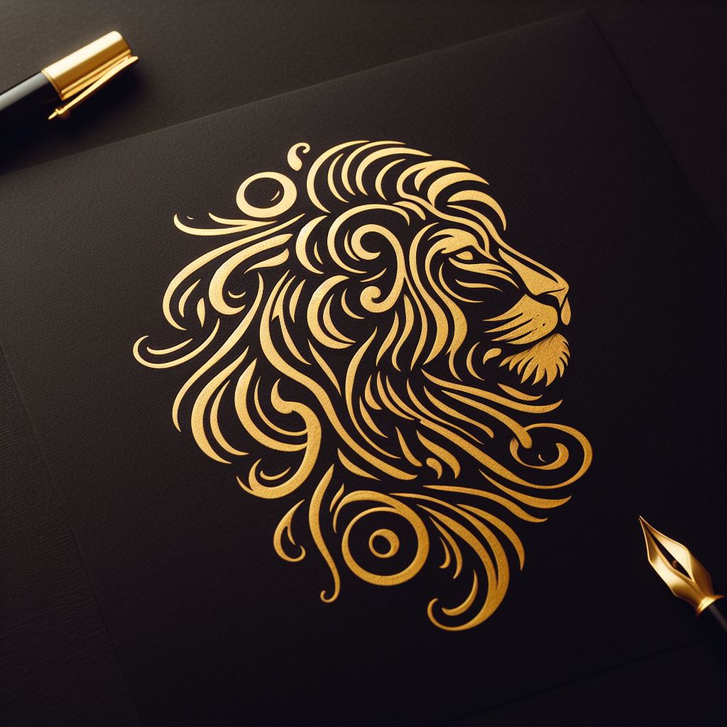 abstract, animal, art, black, calligraphy, design, detailed, drawing, elegant, gold, head, illustration, ink, lion, majestic, mane, ornate, paper, pen, wildlife