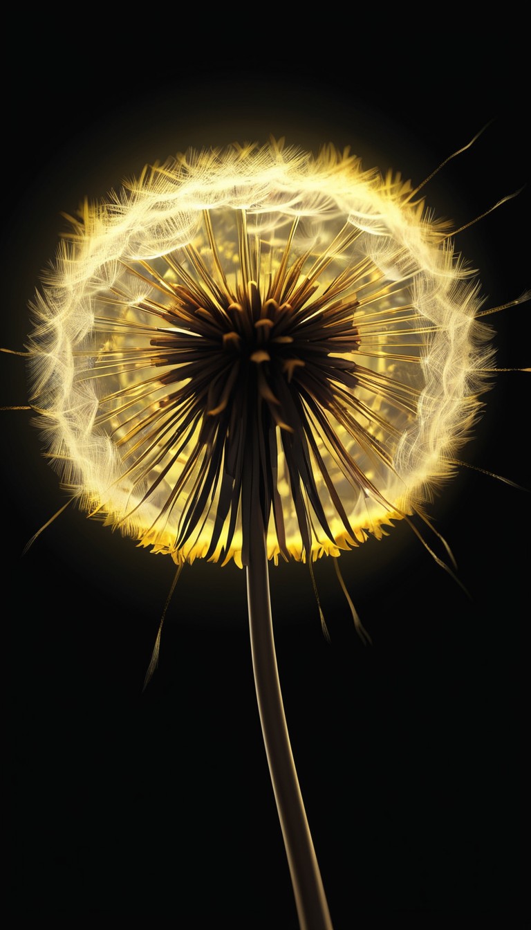A single dandelion seed head illuminated in the dark, its white seeds catching the light.