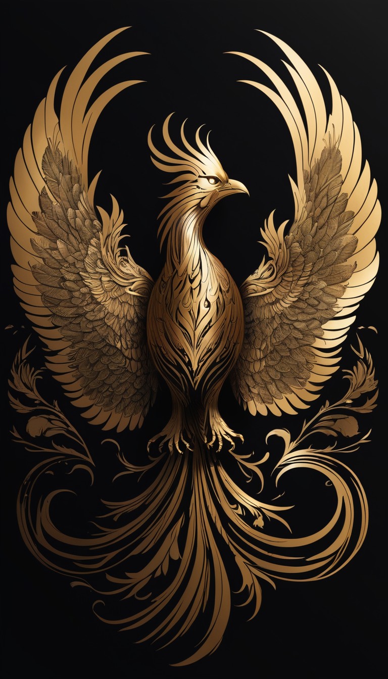 art, artwork, background, bird, black, creature, design, detailed, digital, fantasy, feathers, golden, graphic, illustration, mythical, ornate, phoenix, rebirth, symbol, wings
