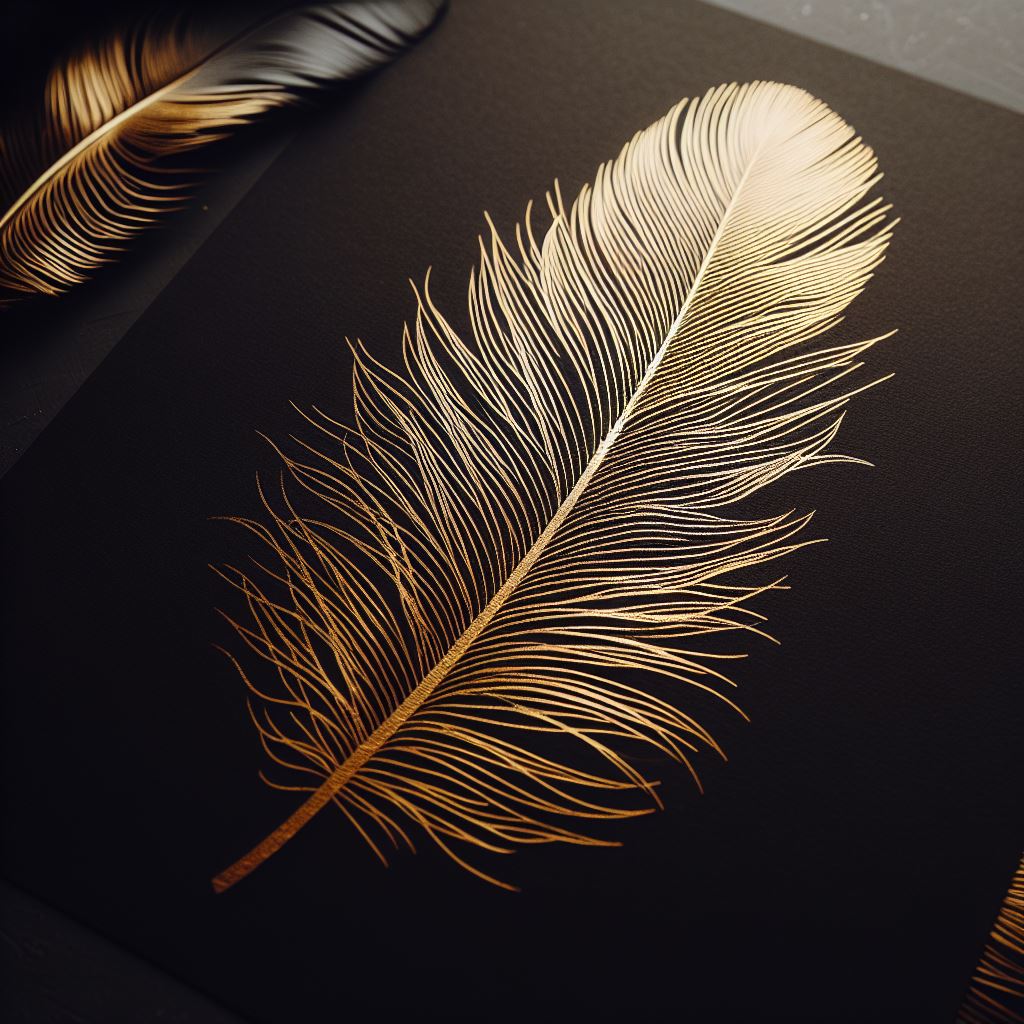 A single, golden feather lies on a black surface, its intricate details emphasized by the contrast.