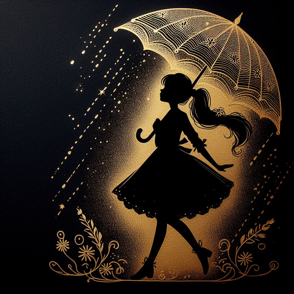 abstract, art, artwork, black, creative, delicate, dress, elegant, fantasy, feminine, gold, illustration, magical, rain, romantic, shadow, silhouette, umbrella, whimsical, woman