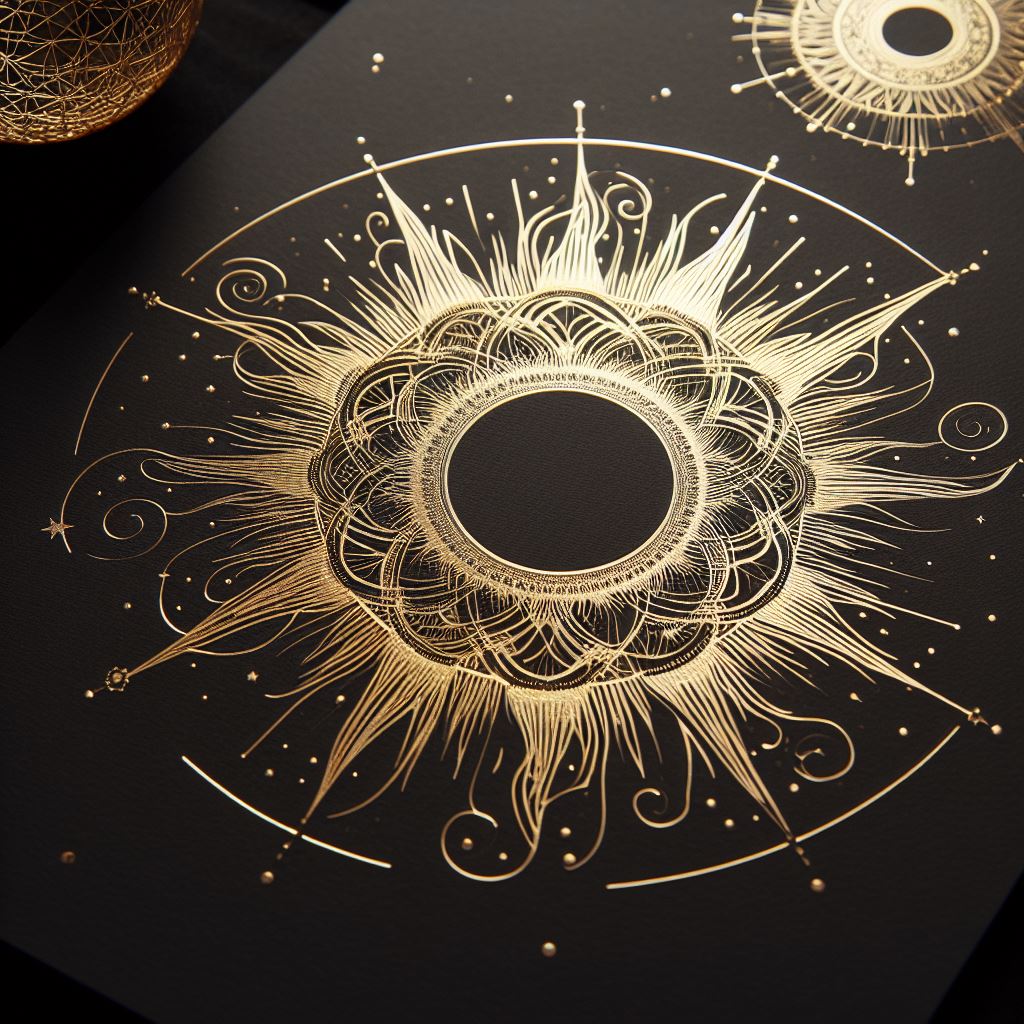 A detailed gold sun mandala with intricate swirls and patterns on a black background.