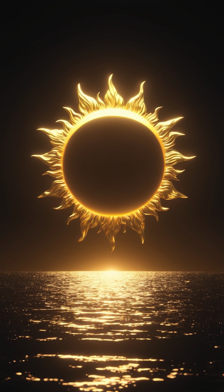 A golden sun with a flaming rim sits above a calm body of water.