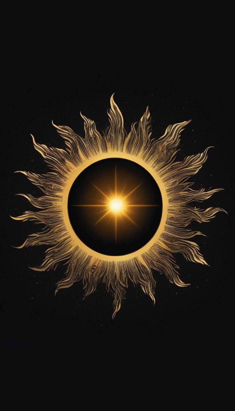 A golden sun with a bright center shines against a black background.