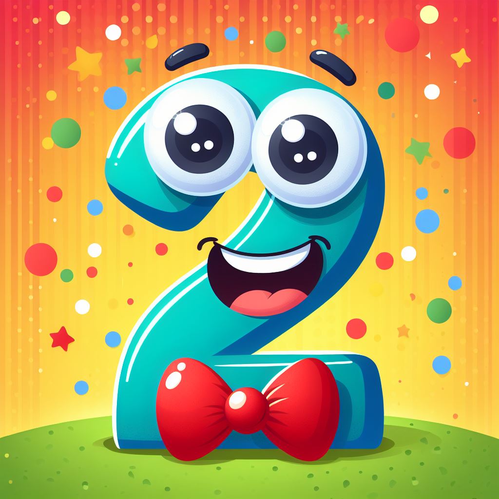 A cartoon number two with a red bow tie smiles, surrounded by confetti and stars on a yellow background.