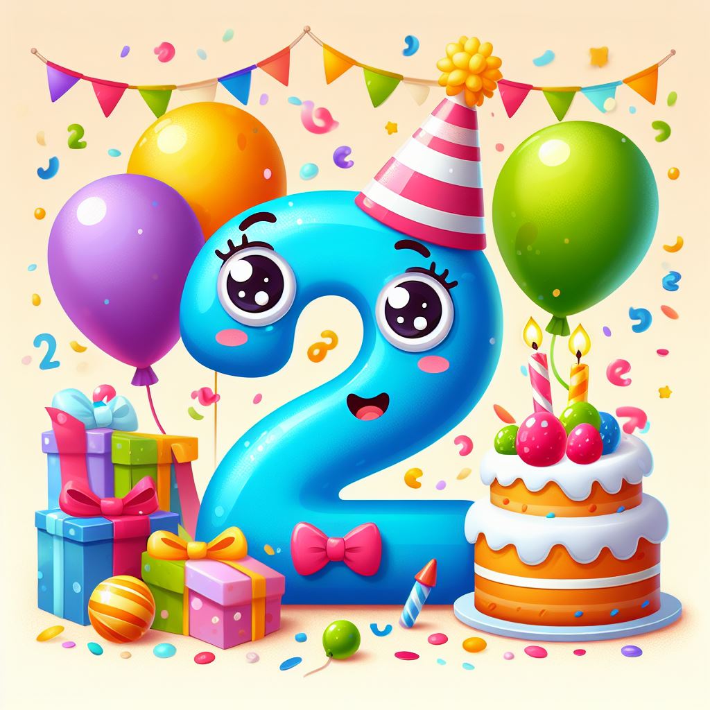 A cartoon number two wearing a party hat, surrounded by balloons, presents, and a birthday cake.