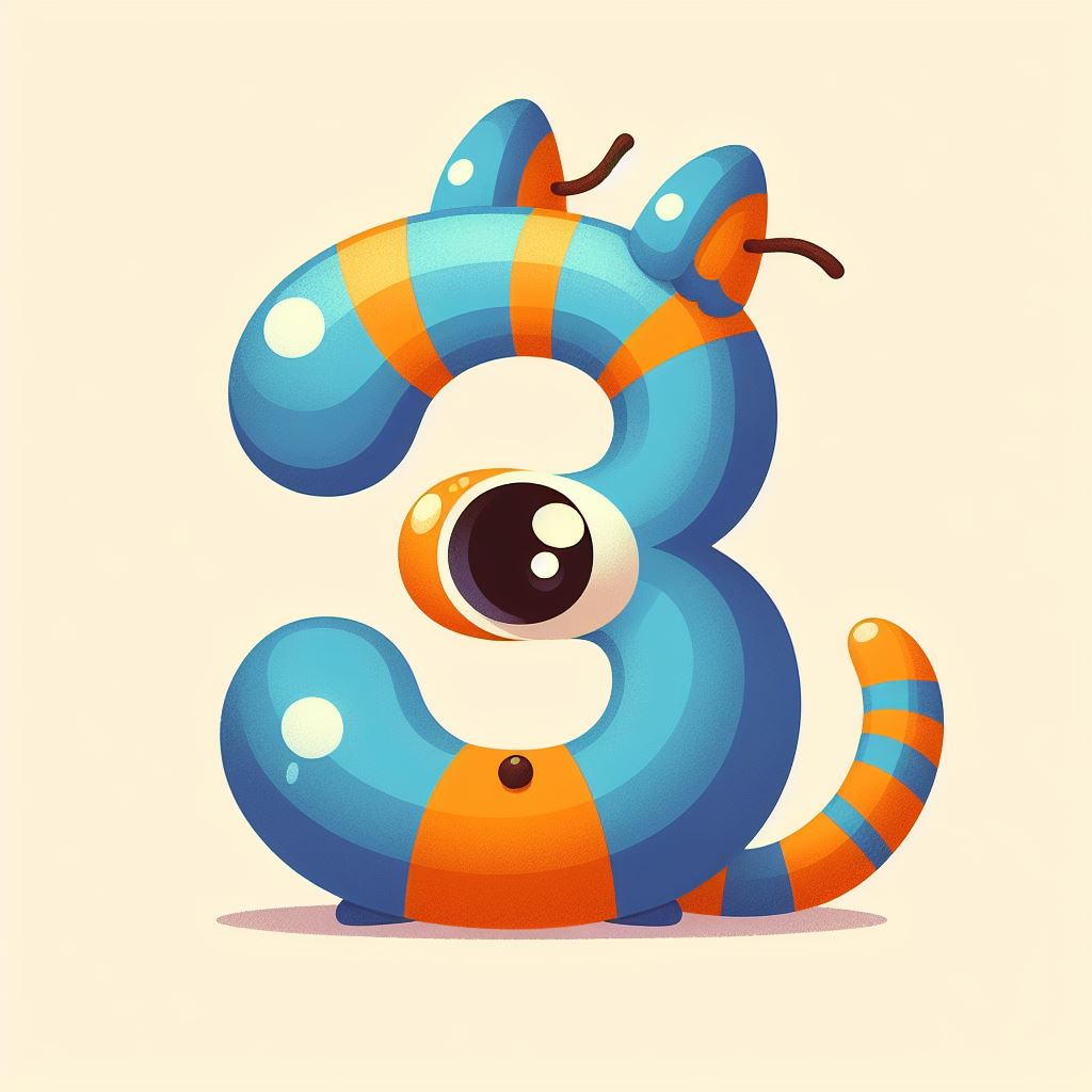 A blue and orange cartoon number three with a single eye, cat ears, and a tail.