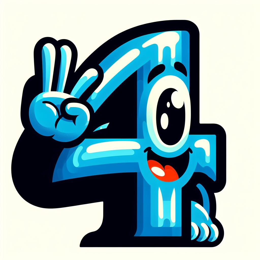 A happy blue cartoon number four with a large eye and a hand raised in a peace sign.