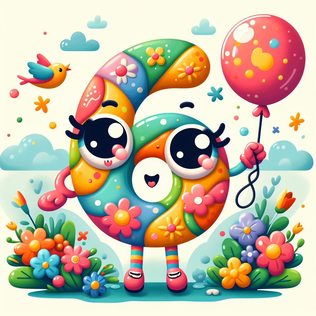 A happy, colorful number six with large eyes and a pink balloon stands in a field of flowers with a little blue bird flying above.