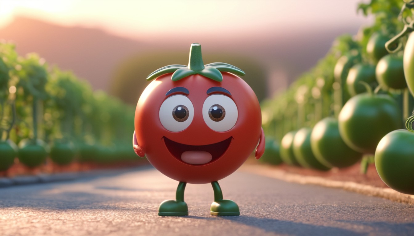 A cartoon tomato with a smiling face stands in the middle of a tomato field.
