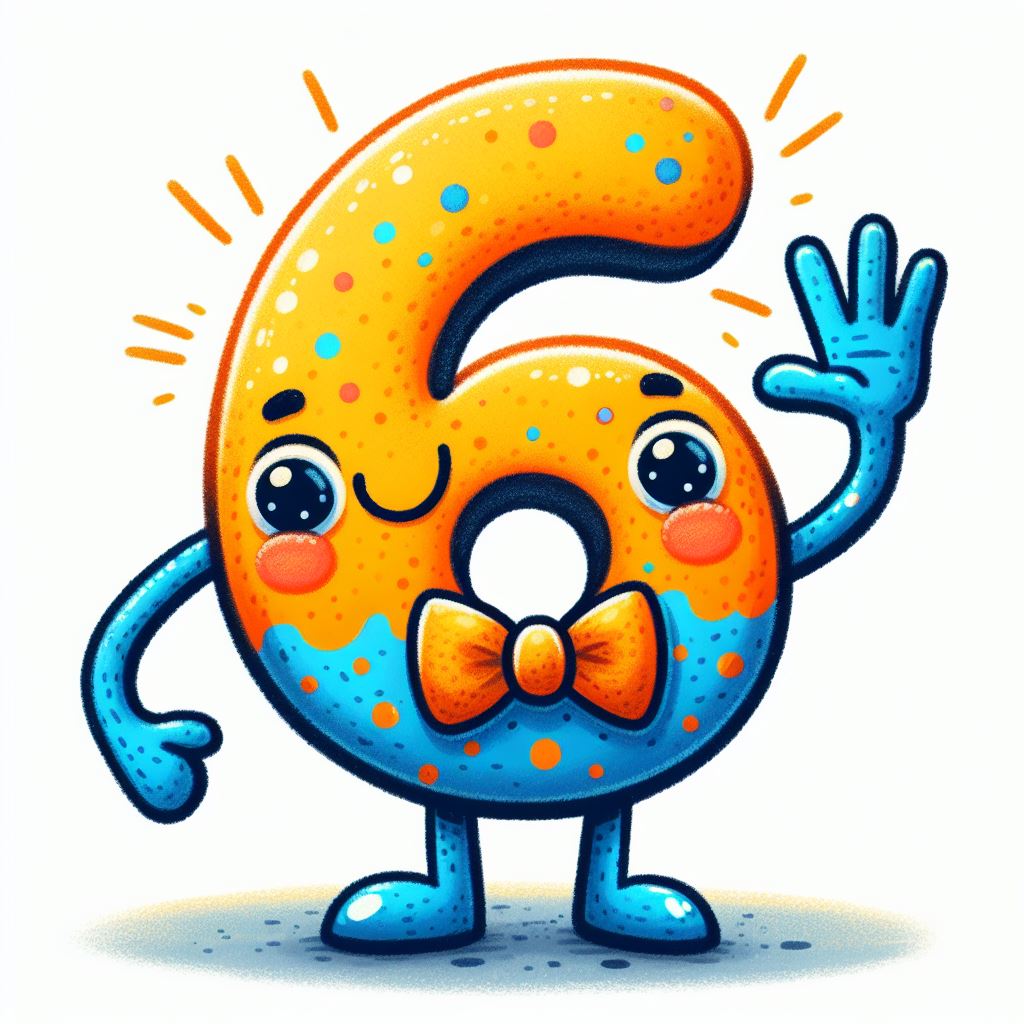 A cartoon number six with a bow tie, blue legs, and orange arms waves with a big smile.