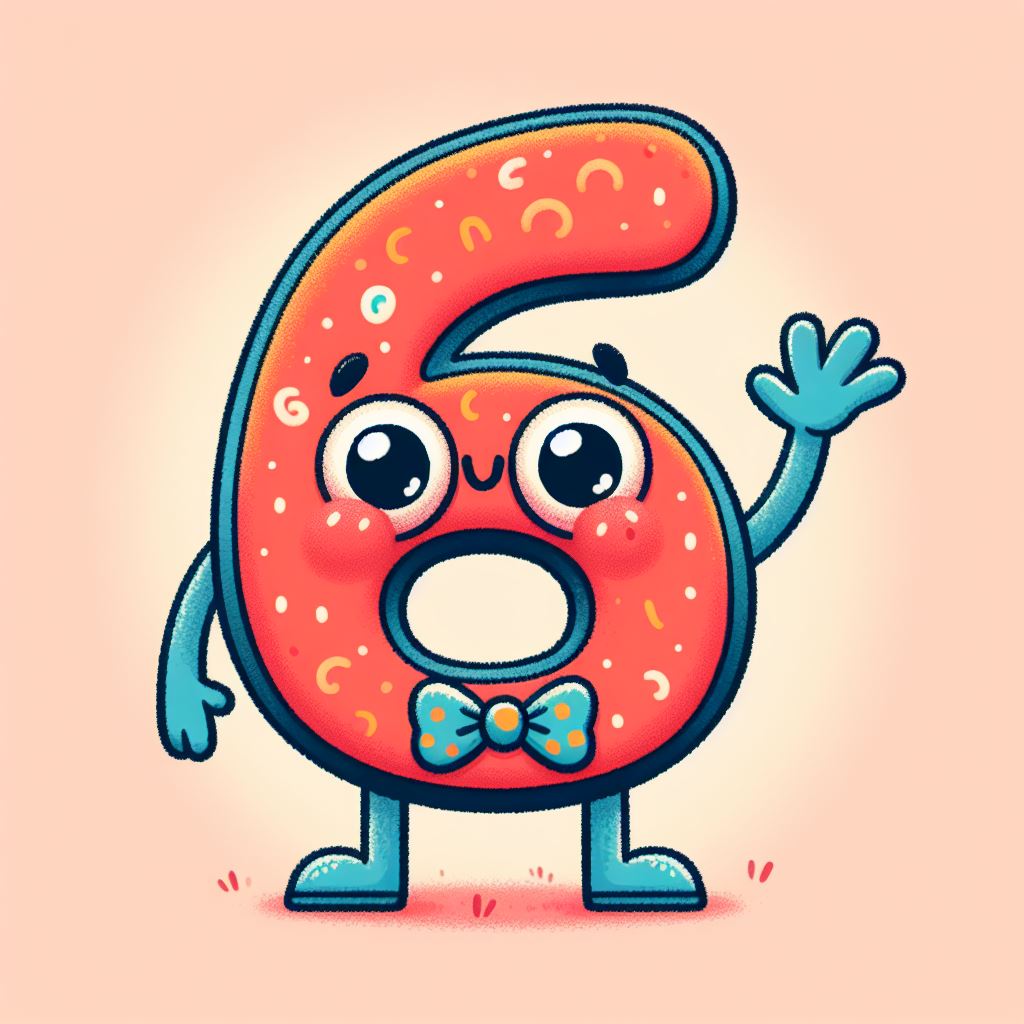 A cartoon number six, wearing a bowtie, with big eyes and a smiling face, is waving with its right hand.