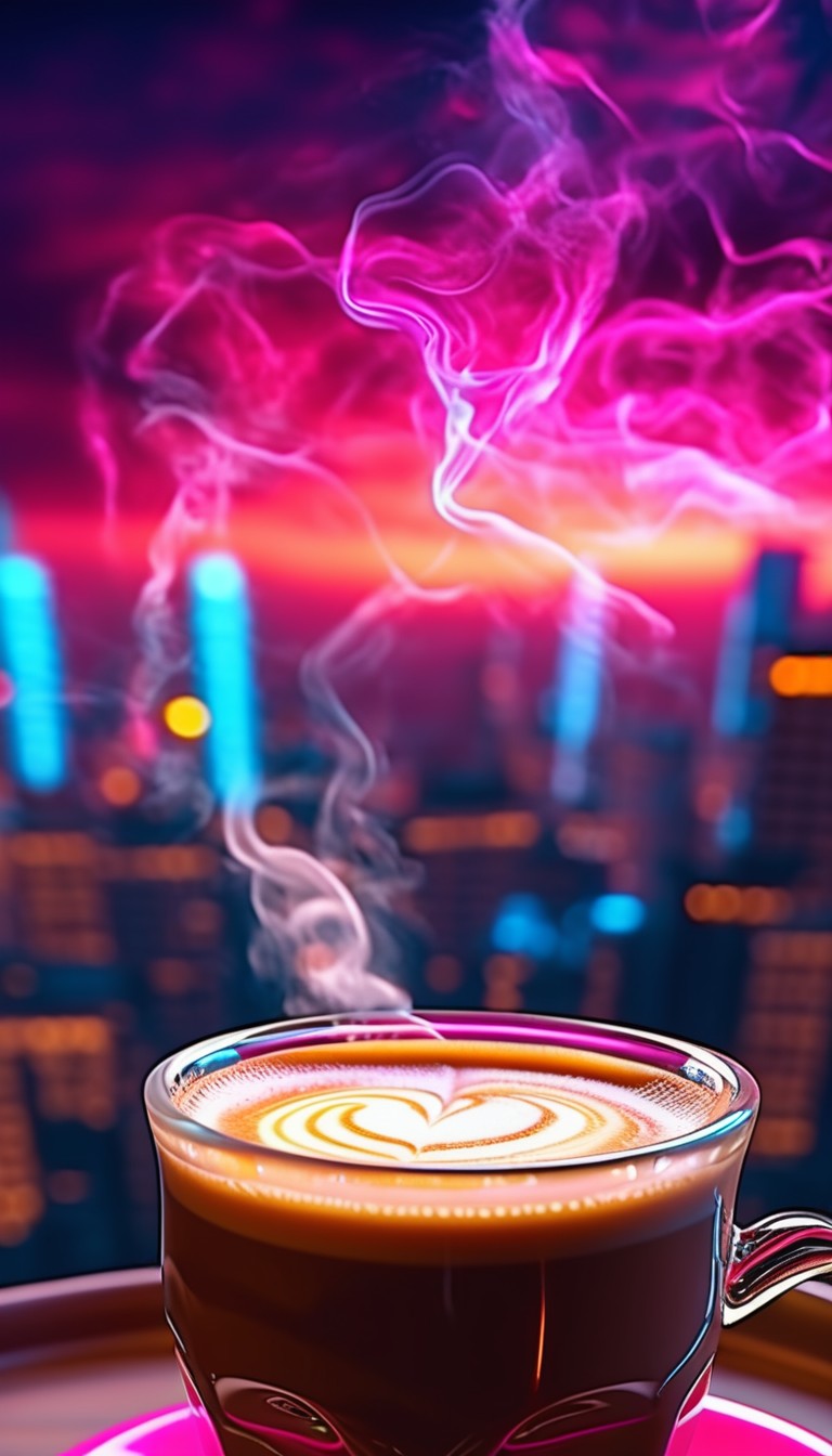 A cup of coffee with a heart design in the foam sits on a table, with the steam rising into the night sky above a colorful cityscape.
