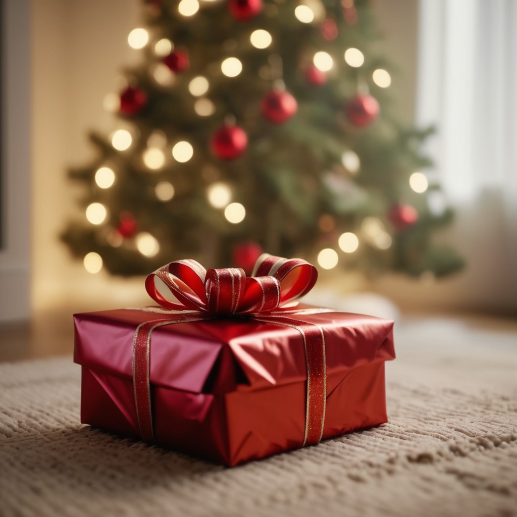 A red gift box with a golden ribbon sits on the floor in front of a Christmas tree decorated with lights and ornaments.
