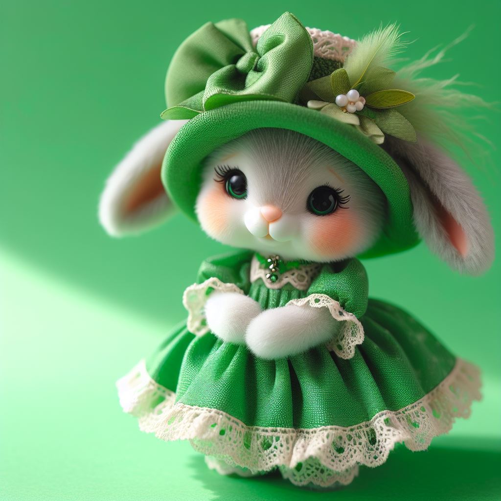 adorable, bow, bunny, cute, doll, dress, eyes, fabric, fashion, figurine, fluffy, green, handmade, hat, lace, plush, sitting, soft, toy, white