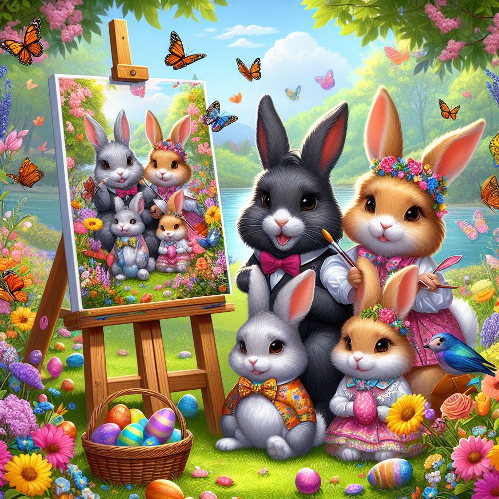 Four bunnies paint in a spring meadow, surrounded by flowers, butterflies, and Easter eggs.
