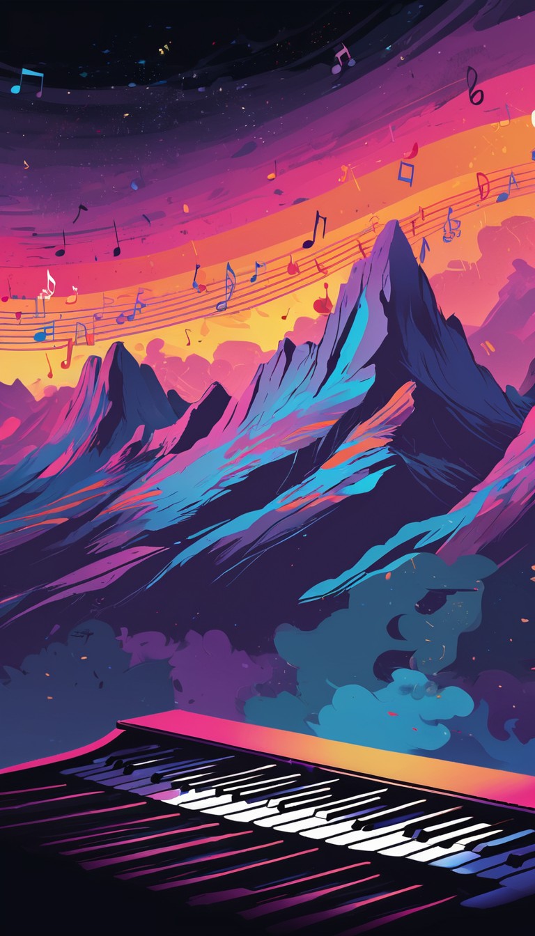 abstract, art, artwork, colorful, composition, digital, dreamlike, harmony, illustration, imaginative, keys, landscape, mountains, music, notes, piano, sky, sunset, vibrant, whimsical
