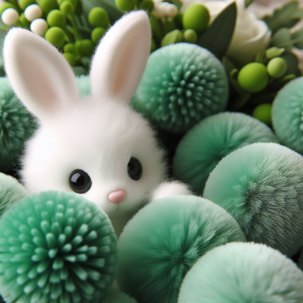 A white bunny with large, black eyes peeks out from behind several green pom-poms.