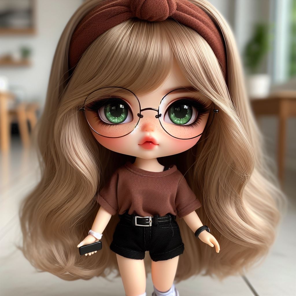 A doll with blonde hair and large green eyes is wearing round glasses, a brown shirt, and black shorts.