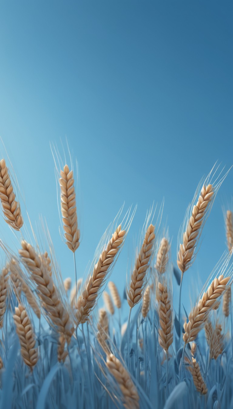 Wheat stalks sway in the wind against a clear blue sky.