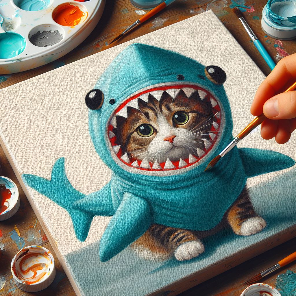 A cat wearing a shark costume is being painted on a canvas with blue and white paint.