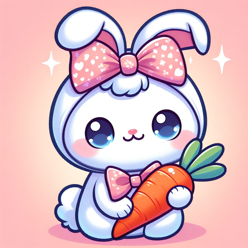 adorable, animal, art, bow, bunny, carrot, cartoon, cheerful, cute, digital, ears, eyes, fluffy, happy, illustration, kawaii, pink, rabbit, smile, sweet