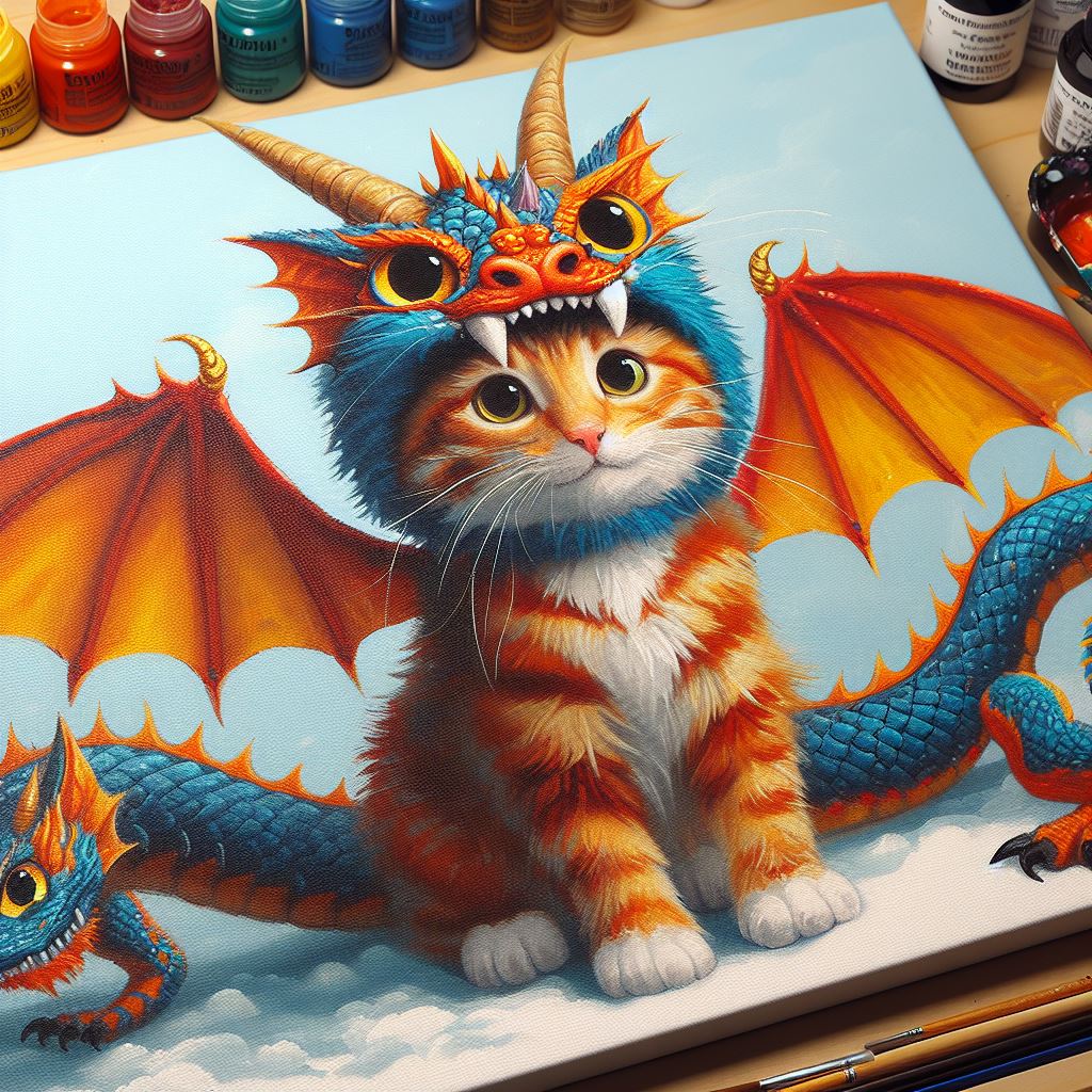animal, art, artwork, blue, cat, costume, creative, creature, cute, dragon, fantasy, illustration, imaginative, magical, mythical, orange, painting, tabby, tail, whimsical