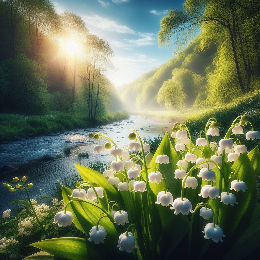 A stream flows through a lush forest, with sunlight shining through the trees and illuminating a patch of lilies of the valley.