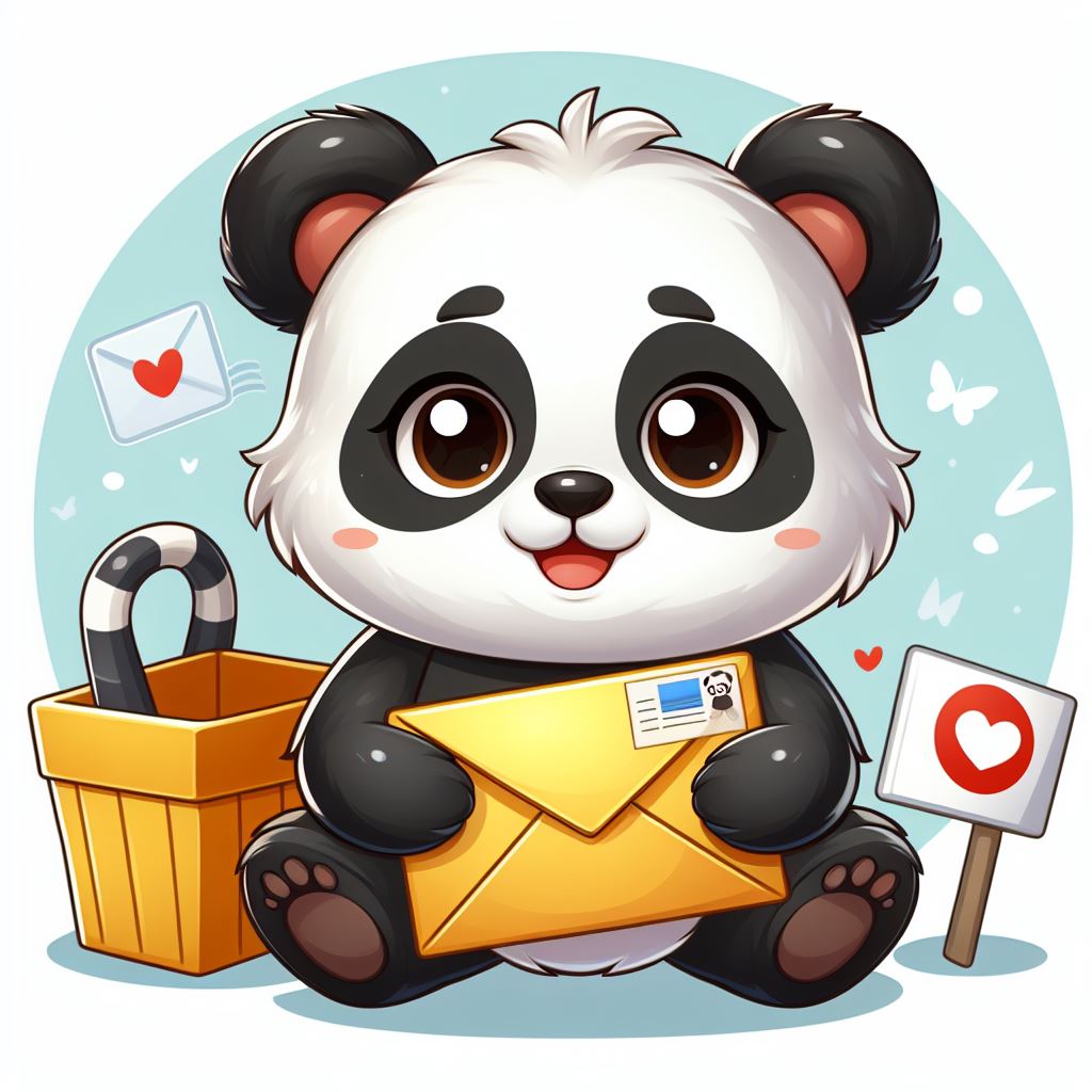 A cartoon panda sits holding a yellow envelope, a basket with a tail sticking out behind it, and a sign with a heart on it to the right.