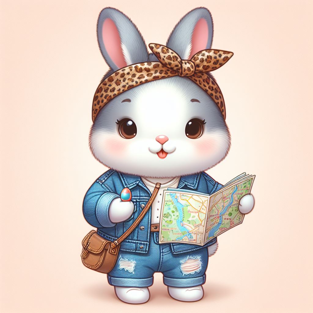 A cartoon bunny wearing a denim jacket and jeans holds a map and a lollipop, looking ready to explore.